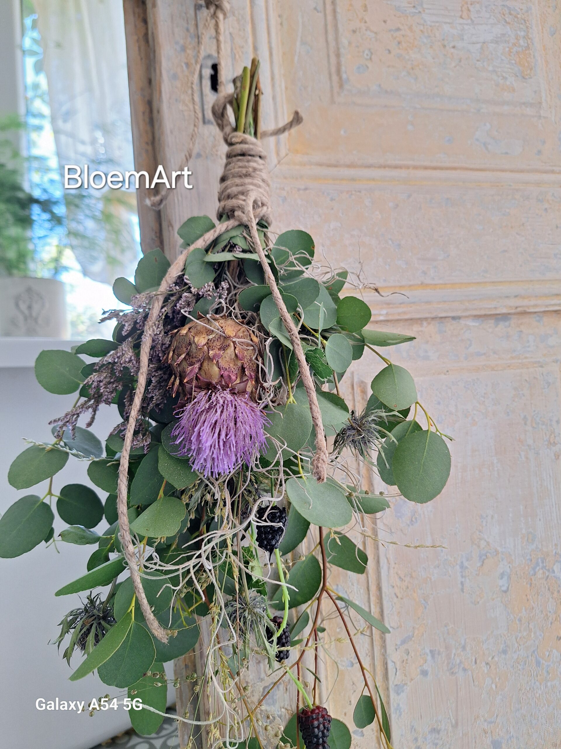 Artisjok toef met o.a. Eucalyptus Tillandsia Distel Limonium en ( kunst) bramen afgewerkt met touw.