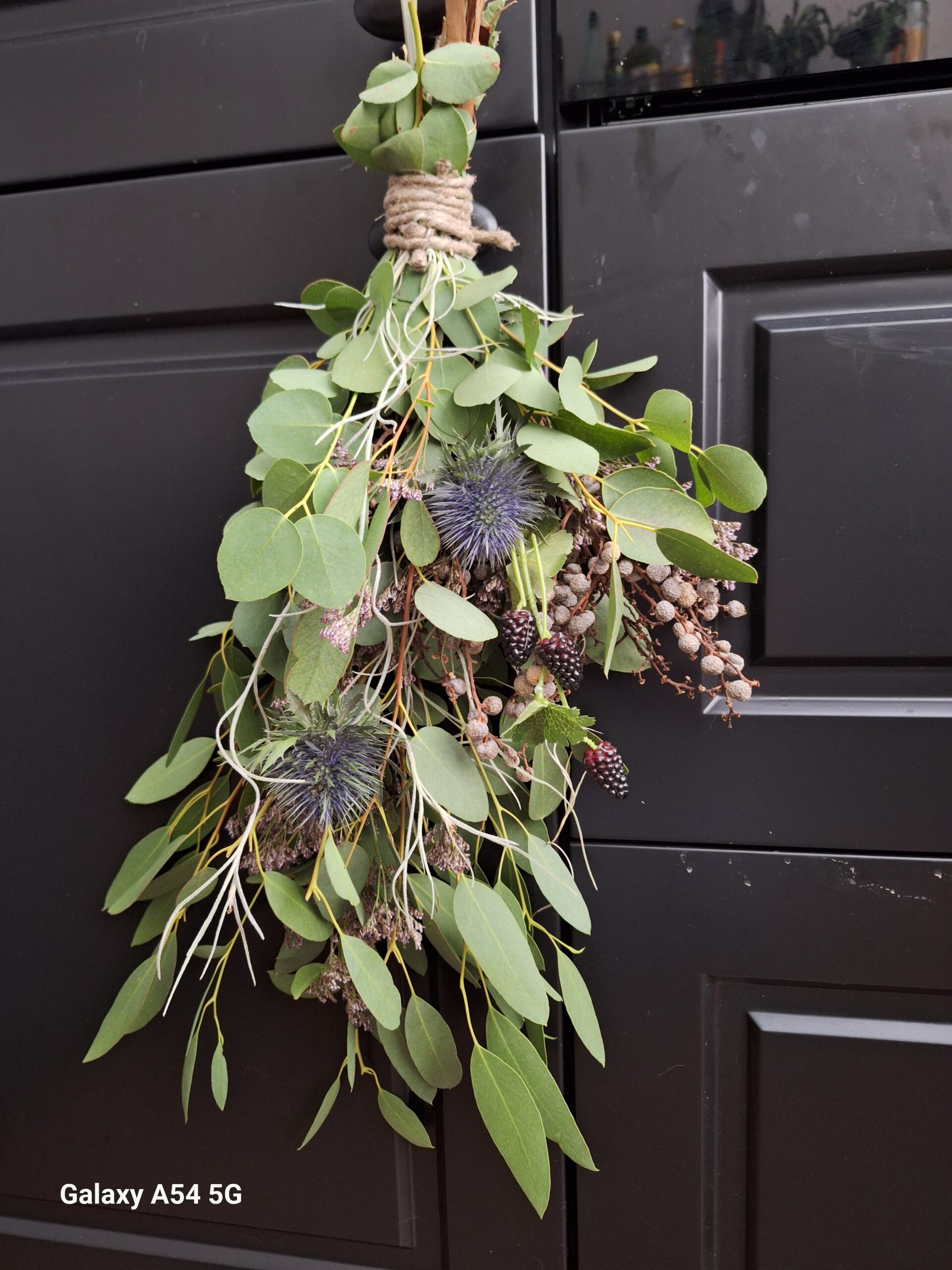 Toef met Distel Eucalyptus Dadels Tillandsia afgewerkt met touw.