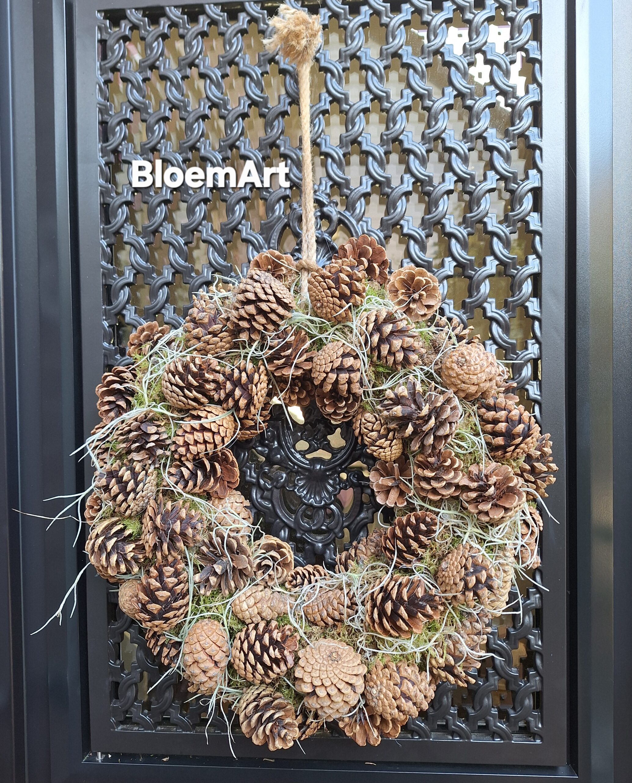 Krans met Dennenappels mos en sliertjes tillandsia ca 45 cm incl touw