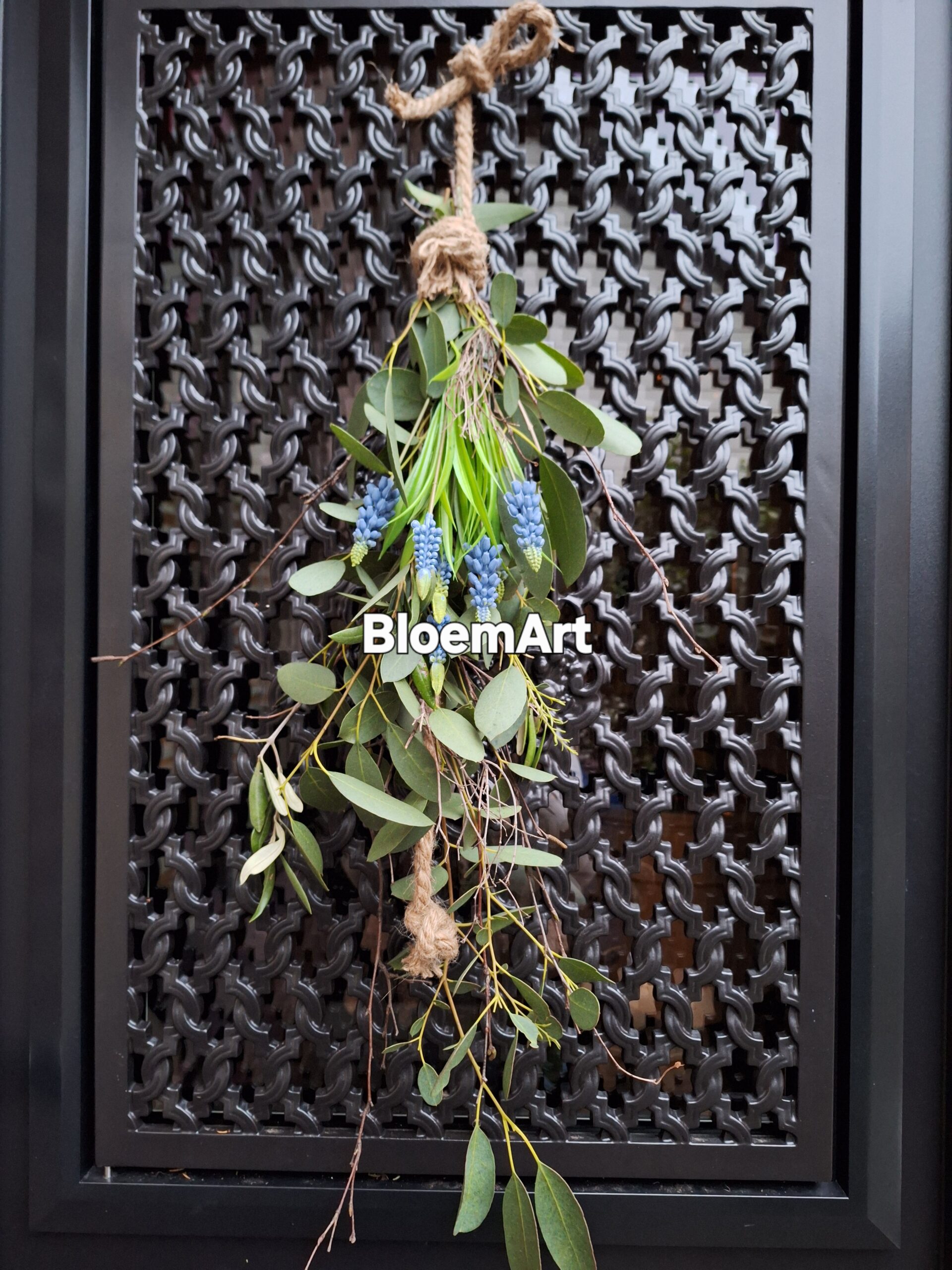 Mooie toef met allerlei groen en berk met een bosje ( kunst) blauwe druif 5 bloemen.