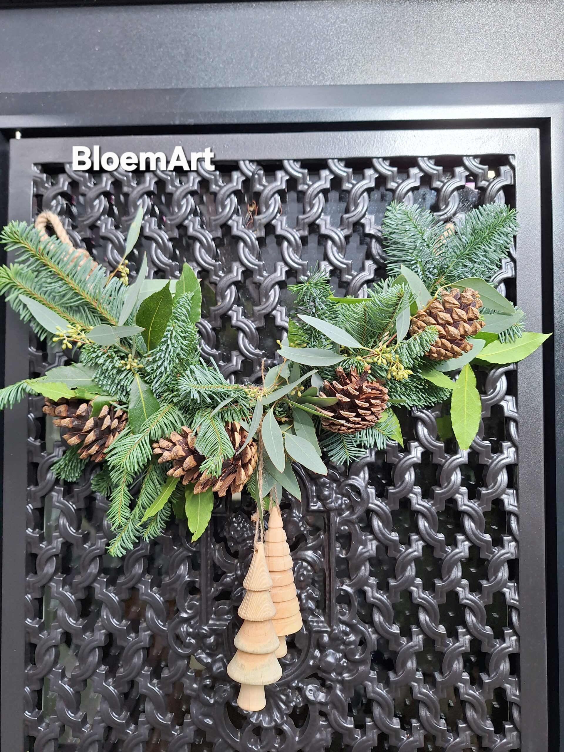 In het pakket zit een beschrijving kerstgroen eucalyptus laurier 4 dennenappels draad touw en 2 houten kerstboompjes.