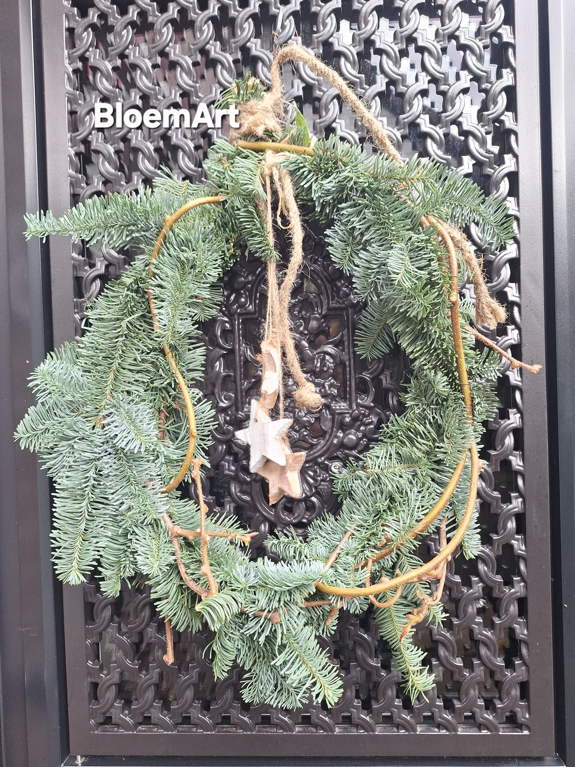 Decoratief Leuk voor bijvoorbeeld aan je voordeur. Deze gezellige hanger is gemaakt met kerstgroen en tussendoor kiwitakken.
