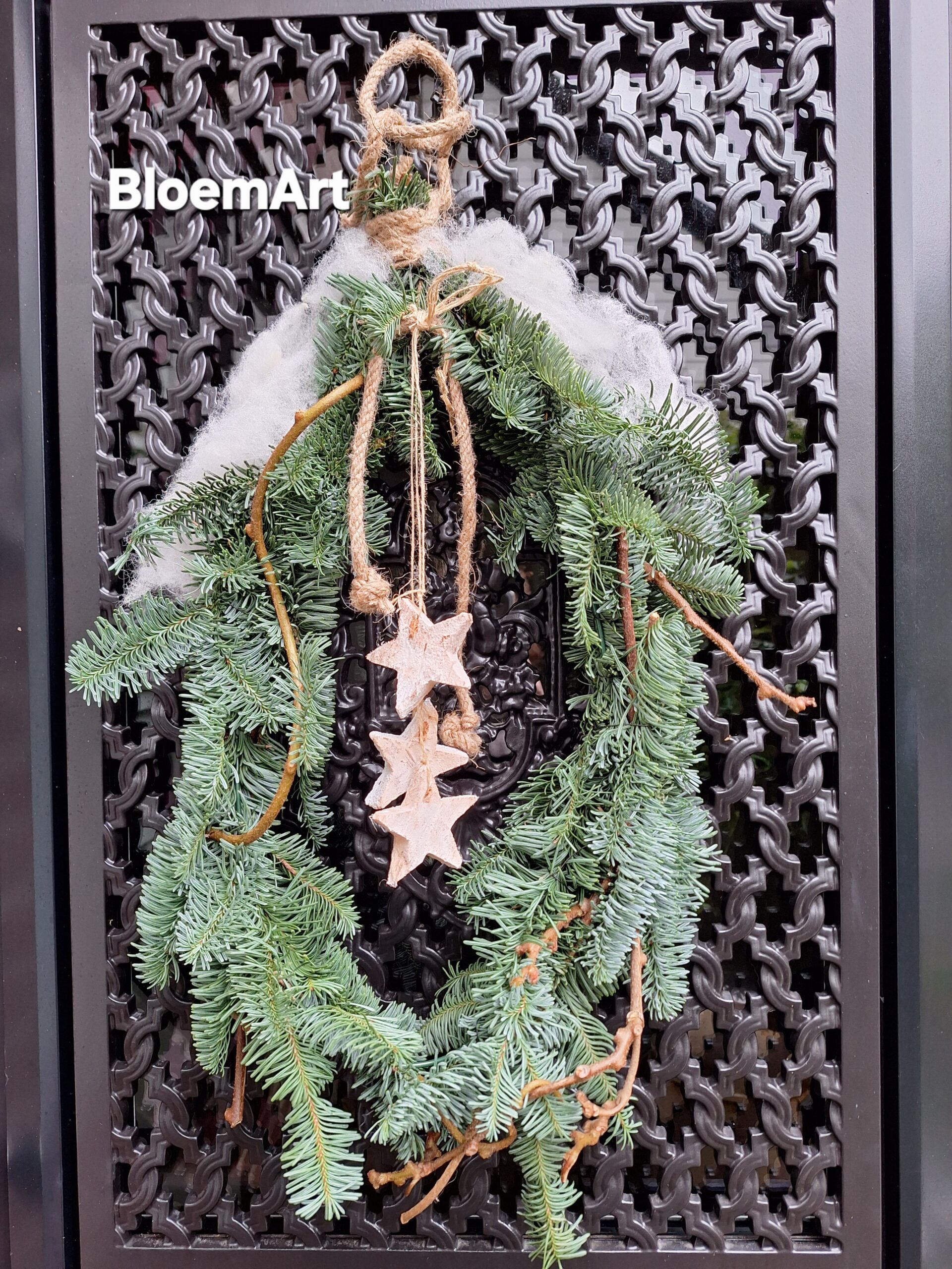 Decoratief Leuk voor bijvoorbeeld aan je voordeur. Deze gezellige hanger is gemaakt met kerstgroen en tussendoor kiwitakken en bovenop een laagje wol ‘sneeuw’.