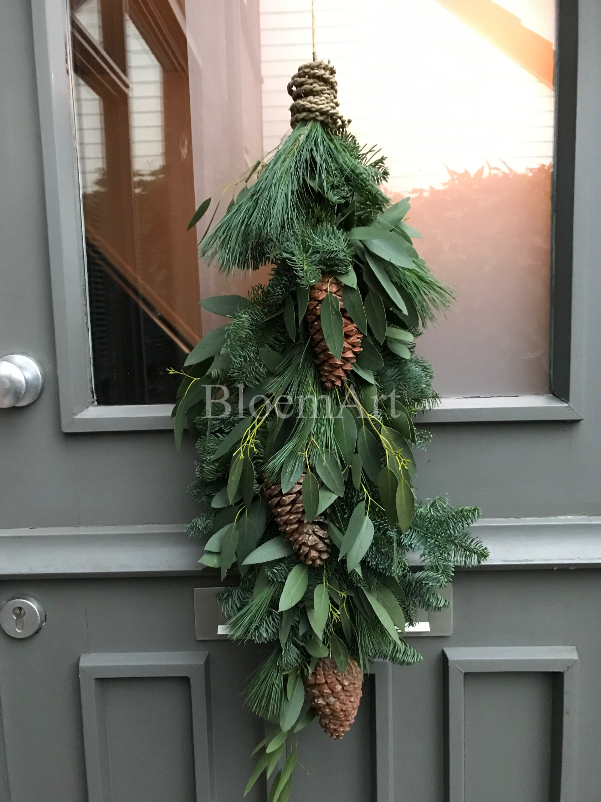 Mooie lange toef wel 90 cm lang met natuurlijke materialen zoals kerstgroen Pinus Eucalyptus en 3 dennenappels maken het helemaal af afgewerkt met touw
