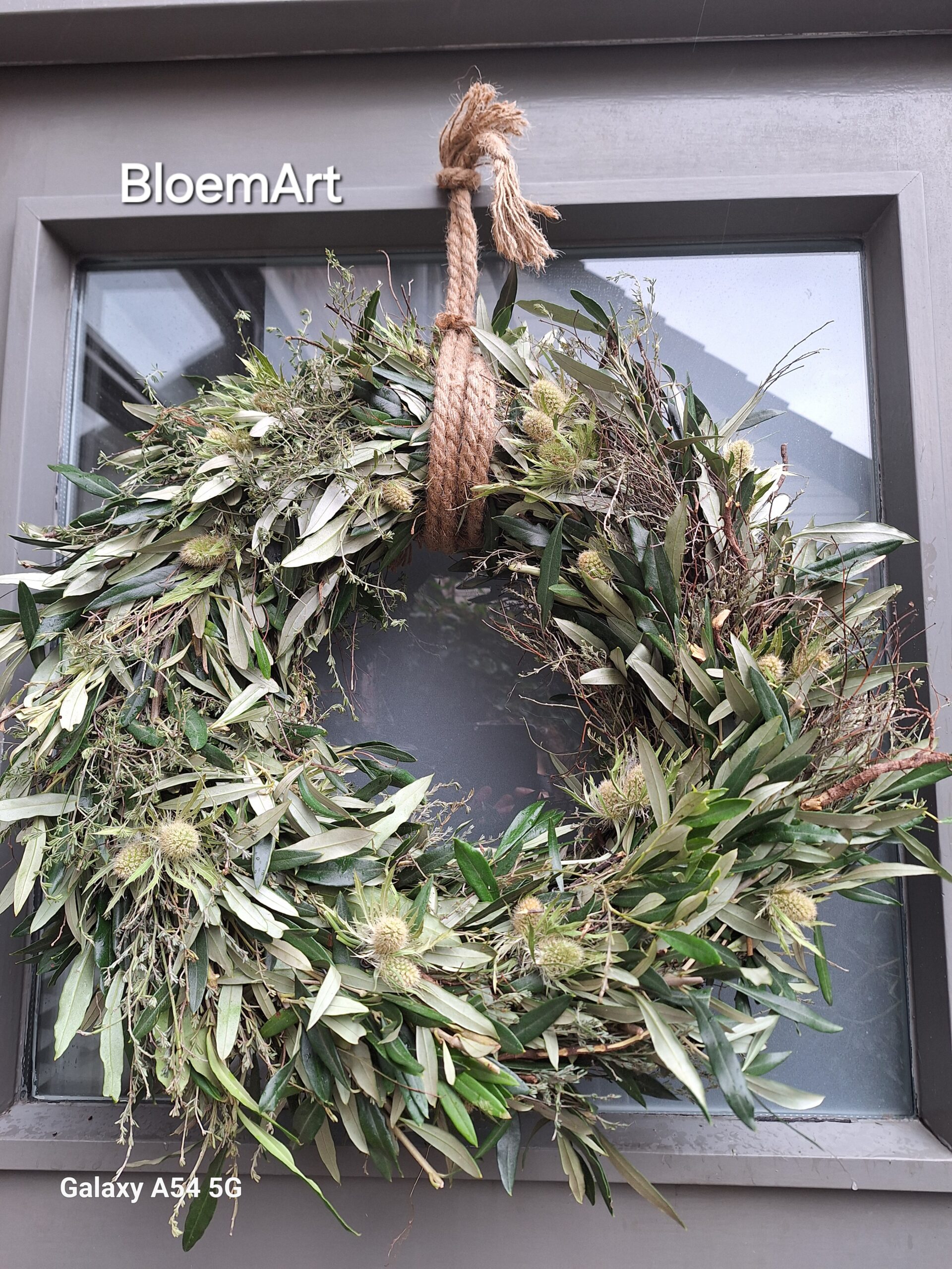 Mooie dikke krans met olijf, witte Distel, en Tijm afgewerkt met mooi touw ca 50cm doorsnede