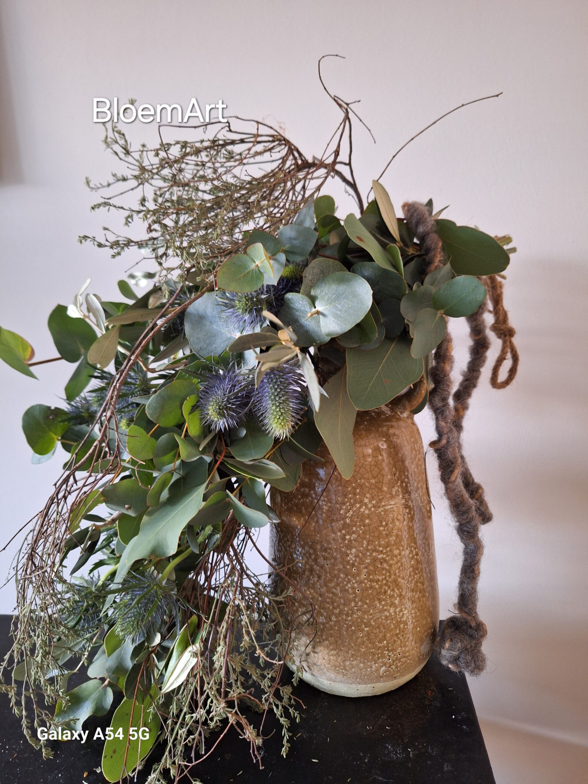 Kruiktoef die je leuk kan decoreren over een vaas of pot met o.a. Eucalyptus Distel Tijm afgewerkt met wollig natuurlijk touw