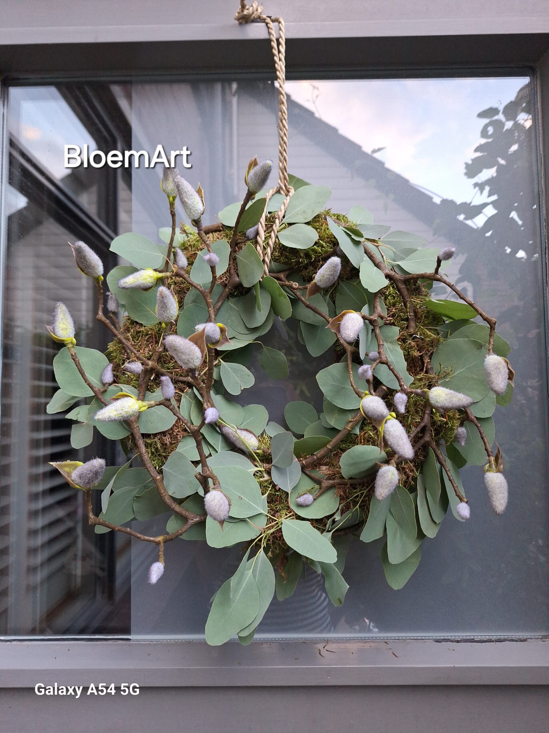 Moskrans daaromheen echte Eucalyptus wat mooi indroogt en kunst Magnolia wat altijd mooi blijft.