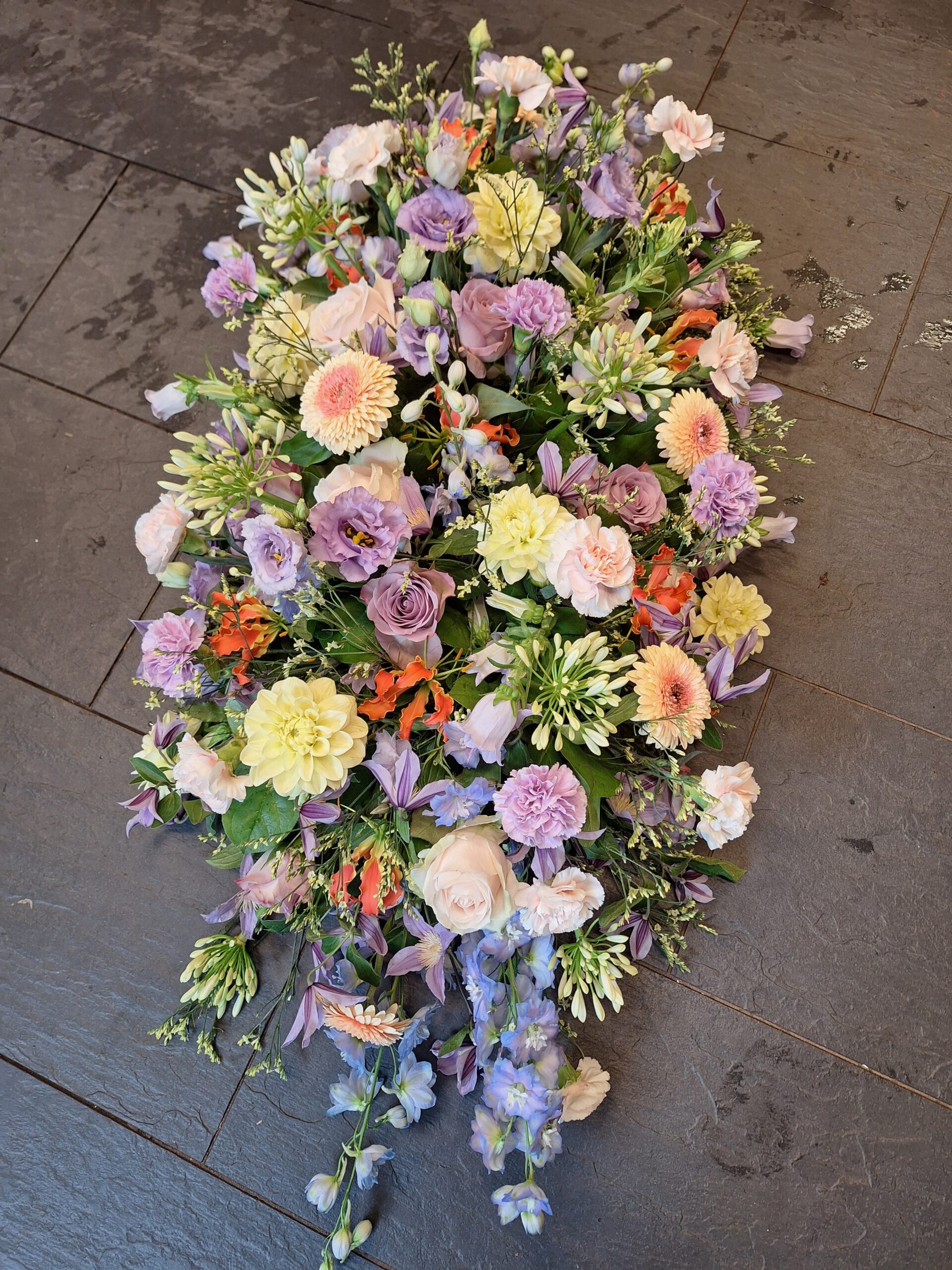 Mooi rouwtak om op de kist te leggen, kan ook in andere kleuren en bloemen gemaakt worden
