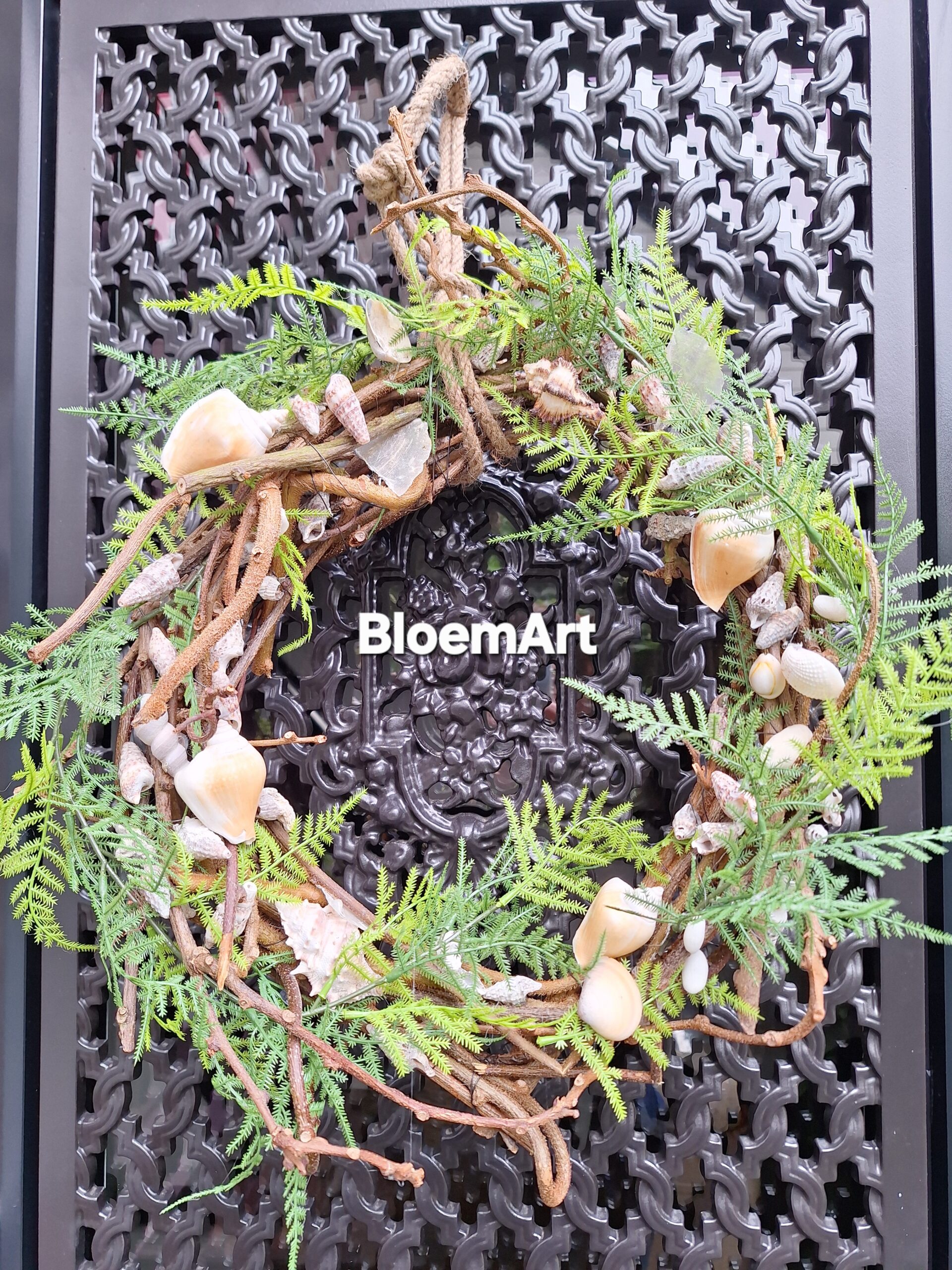De krans is gemaakt van kiwi ranken leuke verschillende schelpen afgewerkt met ( kunst) asparagus