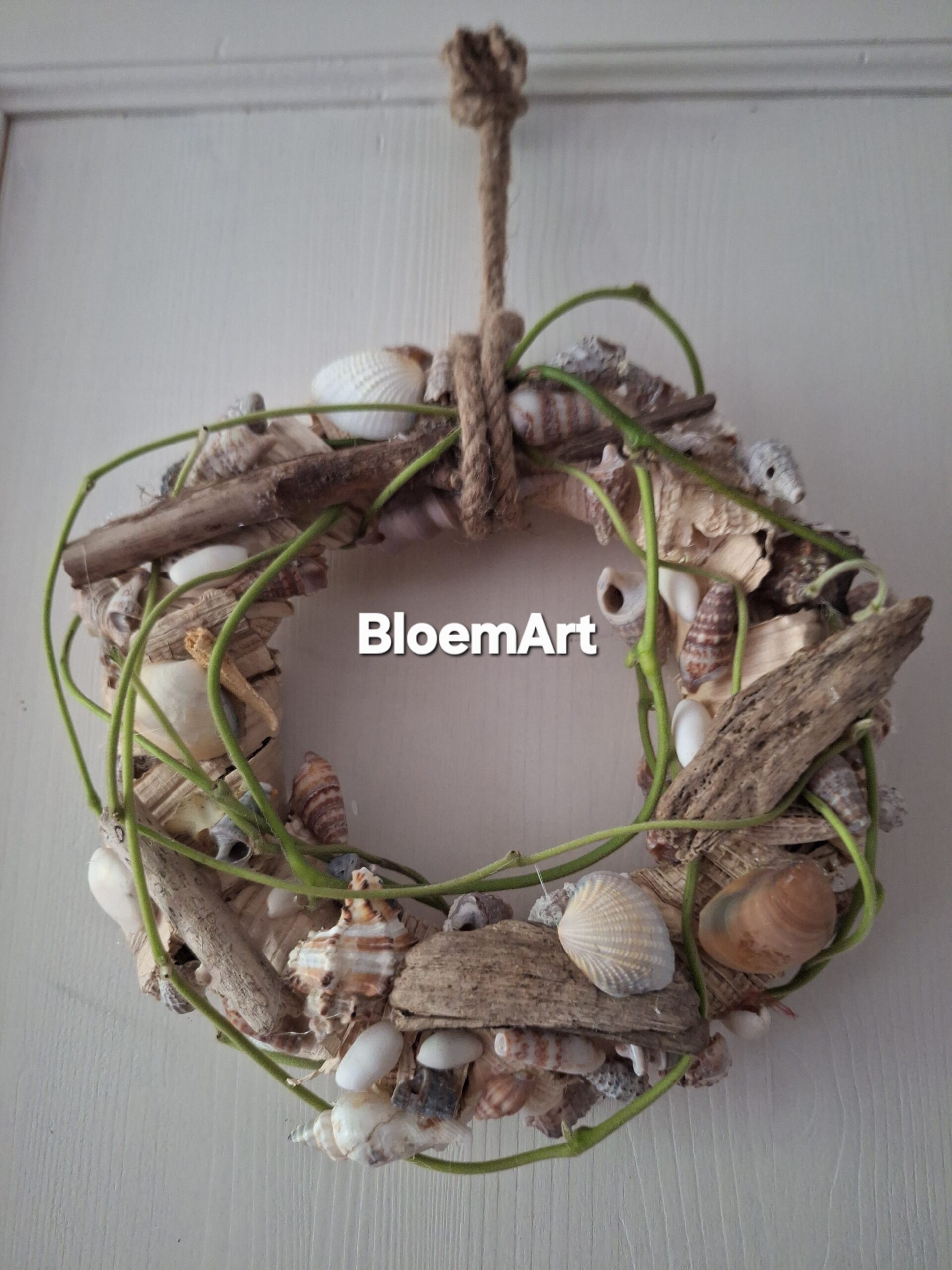 Leuke lieve kleine schelpen kransjes met kleine stukjes verweerd hout, voor om bijvoorbeeld aan je kastdeur op te hangen afgewerkt met sliertjes maakt het wat speelser en luchtiger.