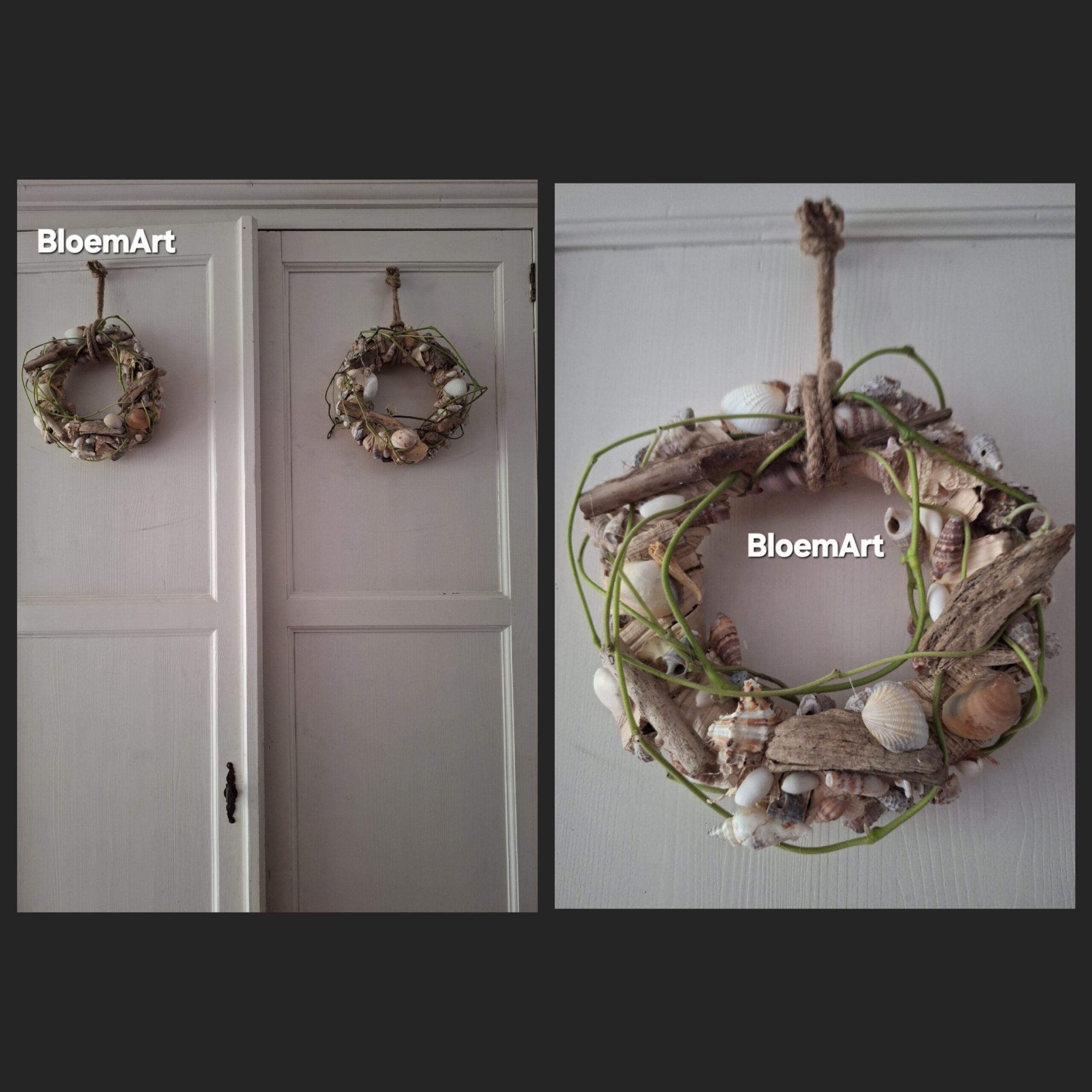 Leuke lieve kleine schelpen kransjes met kleine stukjes verweerd hout, voor om bijvoorbeeld aan je kastdeur op te hangen afgewerkt met sliertjes maakt het wat speelser en luchtiger.