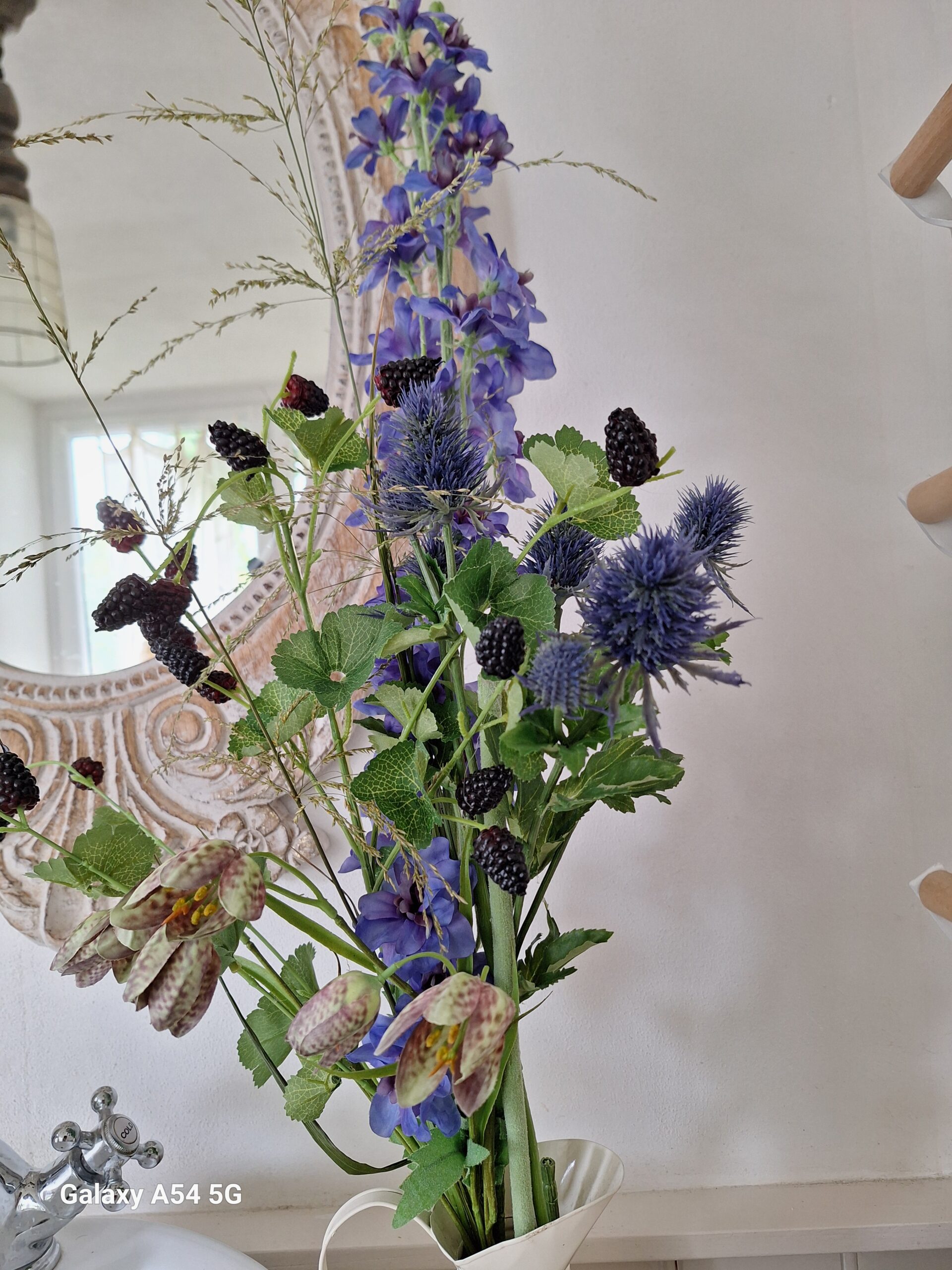 Blauwe toef (zonder vaas) met o.a. Delphinium Distel bramen Fritillaria en met echt gras droogt mooi op en in.