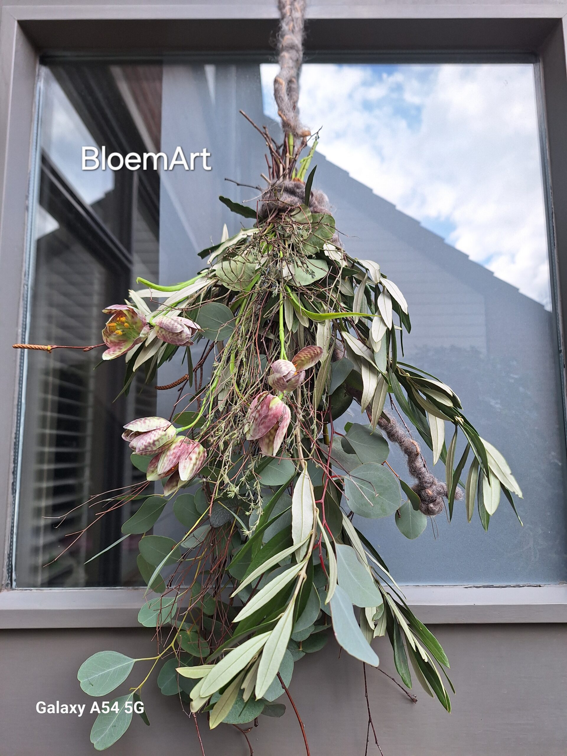 Voorjaarstoef met ( kunst) Fritillaria oftewel Kievitsbloem e.o. Eucalyptus Olijfgroen en tijm afgewerkt met natuurlijk wol touw.