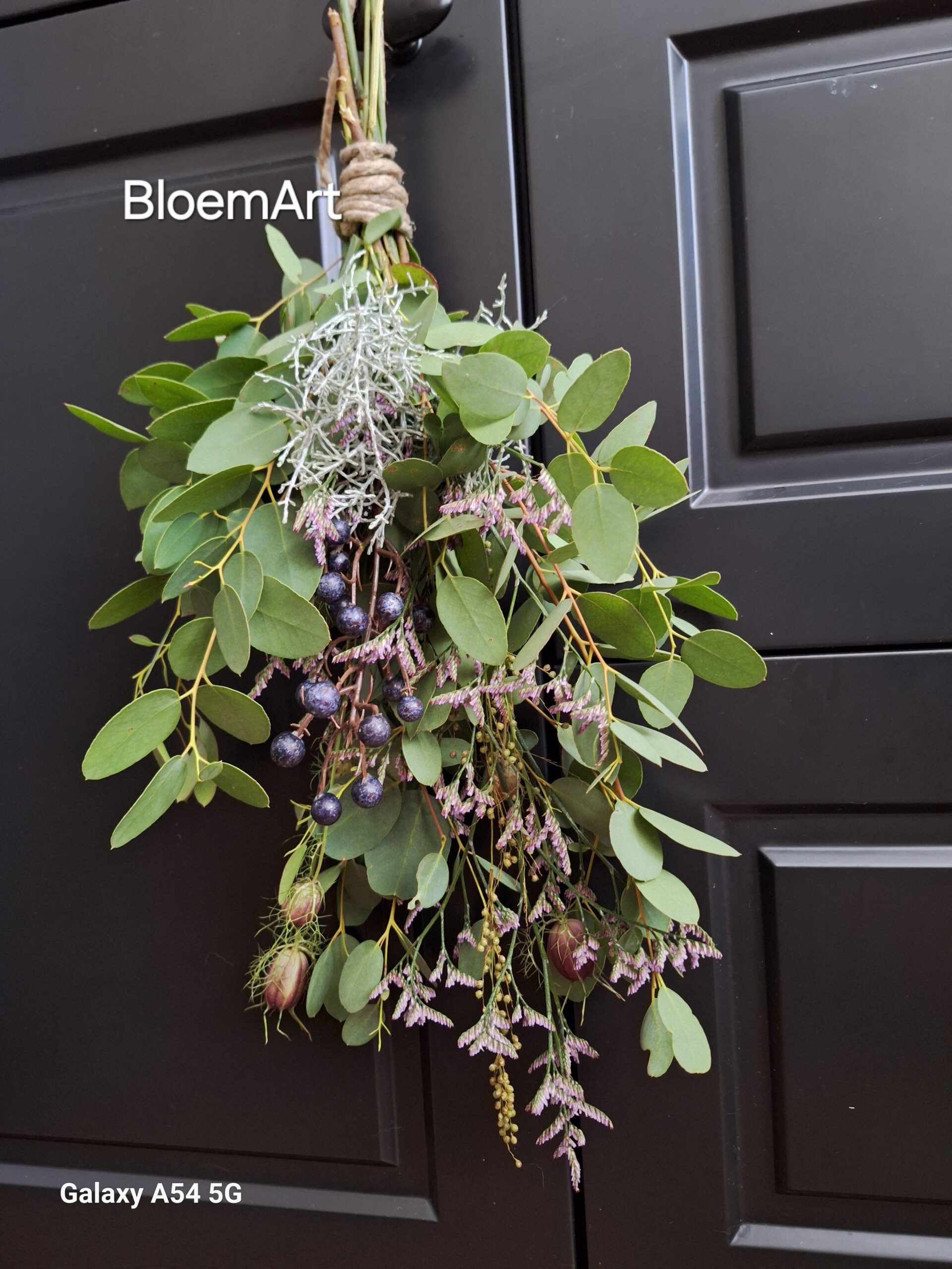 Toef met ( kunst) zwarte bes en o.a. Eucalyptus Limonium.