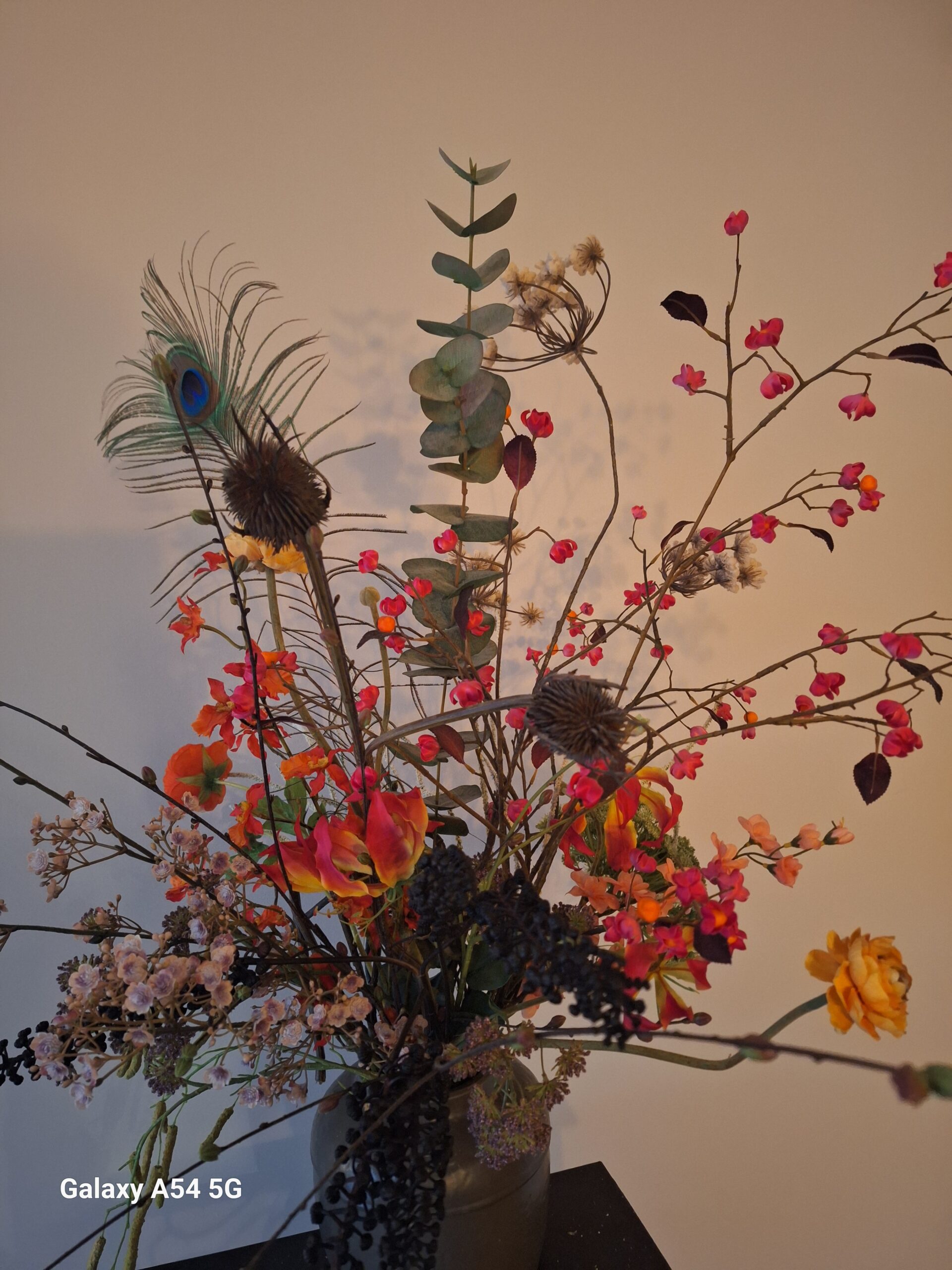 Heb je zelf een leuke vaas of pot en wil je daar graag een zijde boeket in hebben waar je jaren plezier aan heeft dan kan dat gemaakt worden. voor je ongeveer richtprijs van dit boeket is 250,00. Zo’n boeket kan je ook als basis gebruiken en dan met 1 of 2 takjes aanvulling dat het meer zomers/ lente sfeer krijgt of herfst/ wintersfeer.