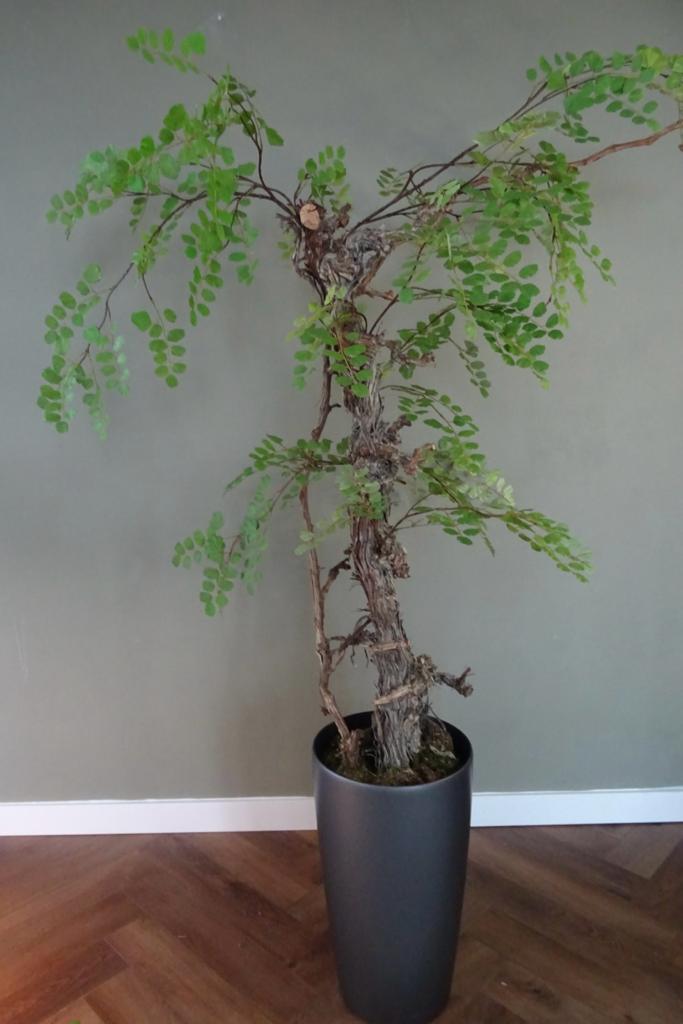 Zijde boom van wel 200 cm hoog ( zonder pot) op natuurlijk hout gemaakt.