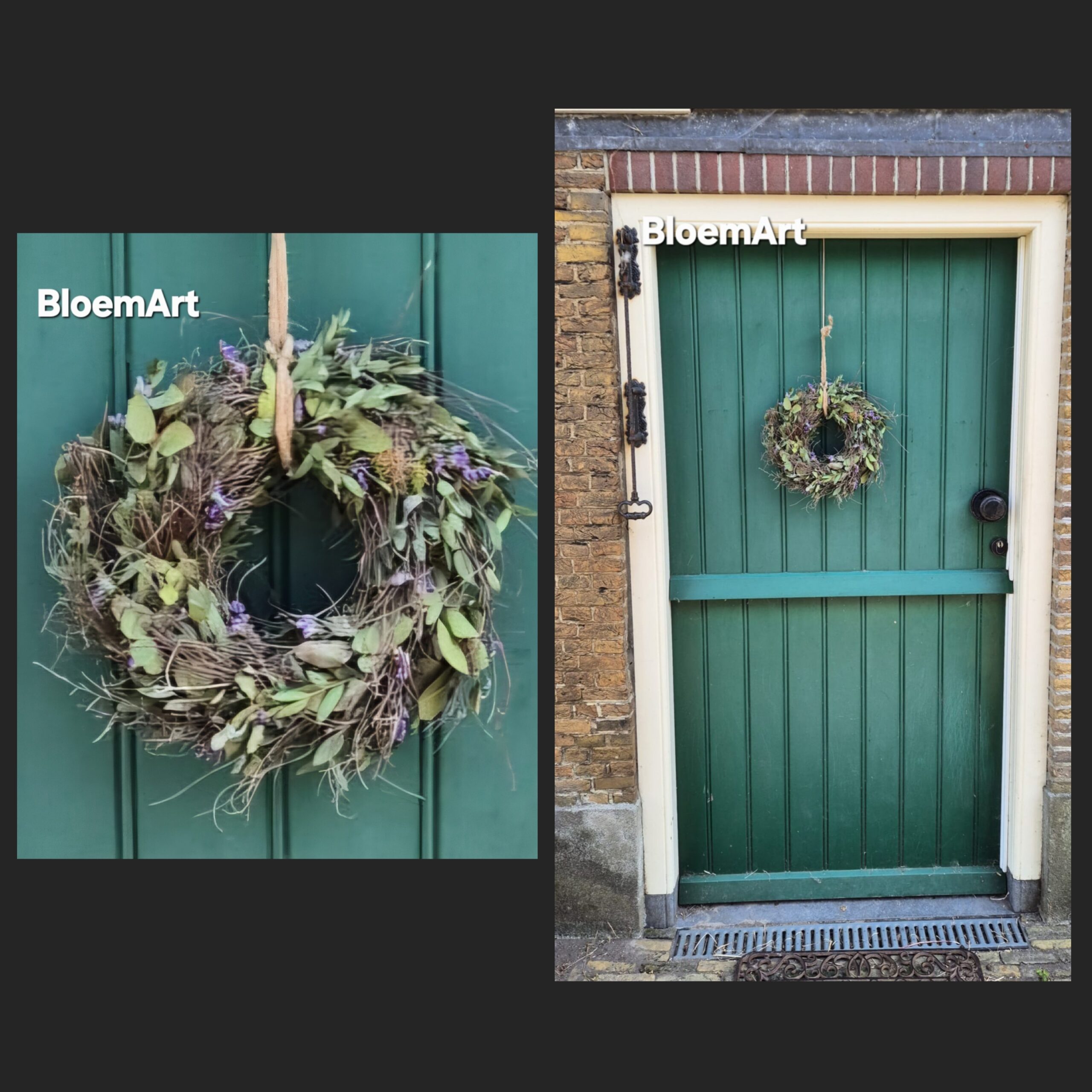 Deze gezellige krans is gemaakt met Eucalypthus Limonium Tijm